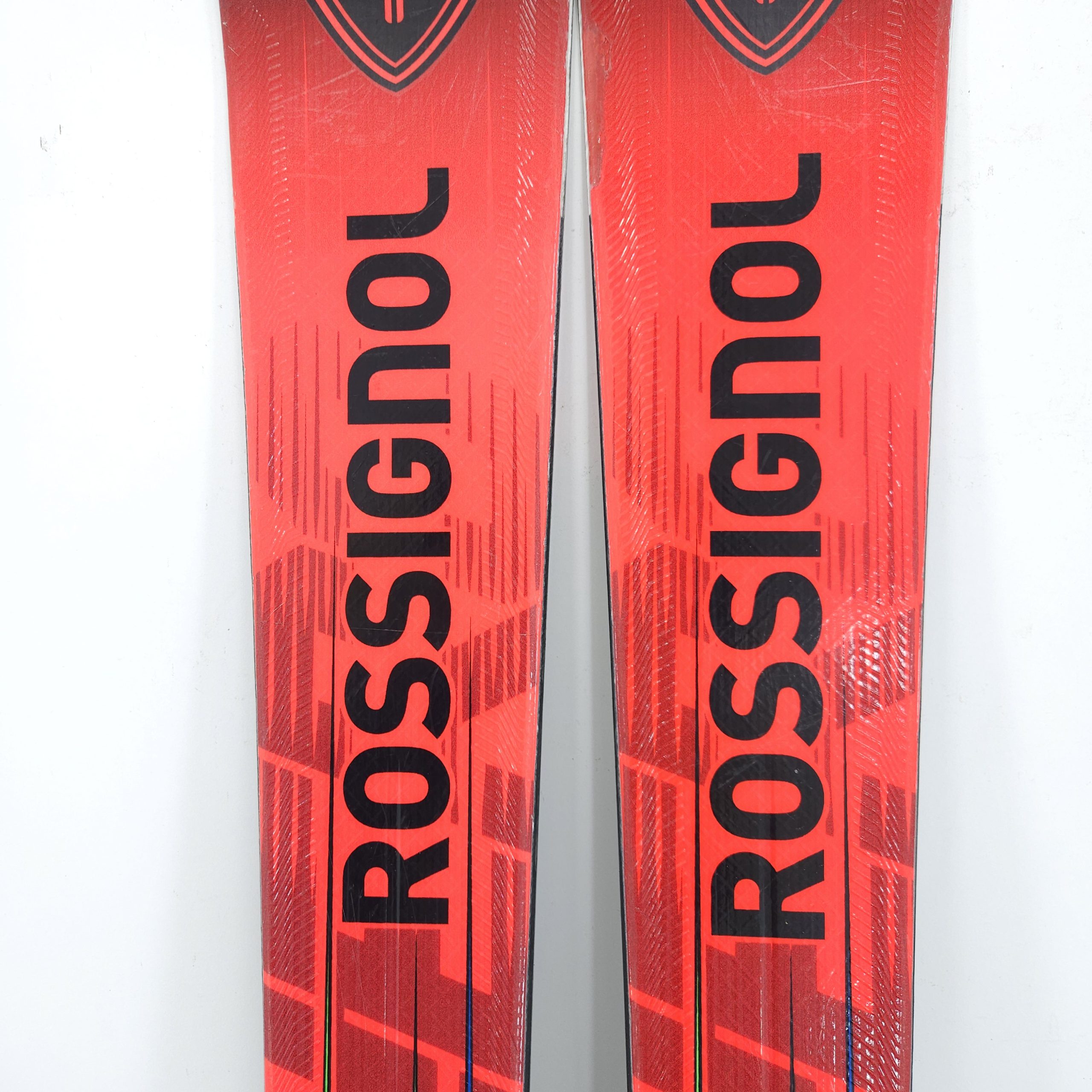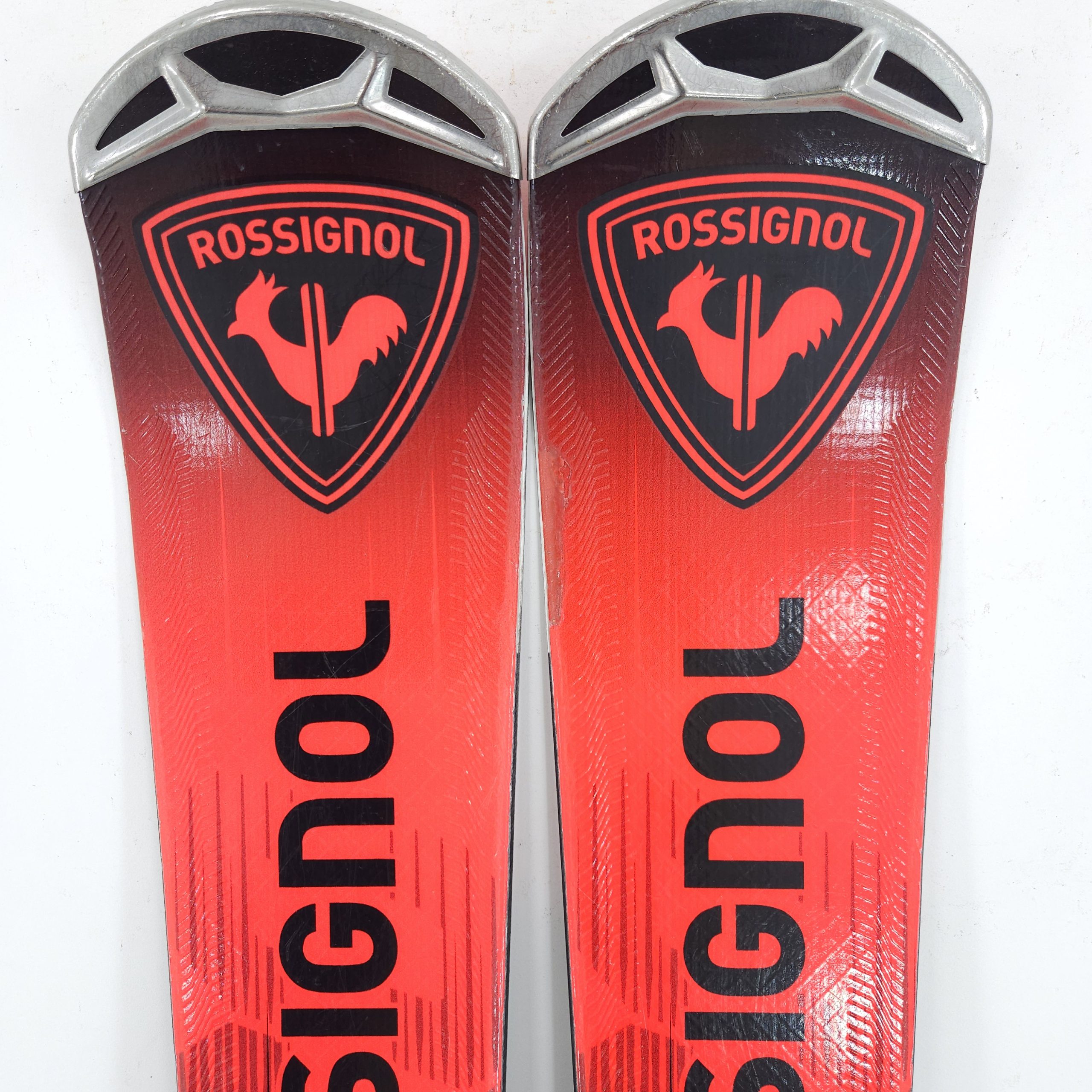 Stare generala foarte buna. Putine urme de utilizare cu exceptia unei julituri superficiale pe partea superioara la unul din schiuri. Aceasta a fost rectificata (vezi foto). Talpa si canturile sunt in stare foarte buna. Complet servisate, pregatite de sezon.